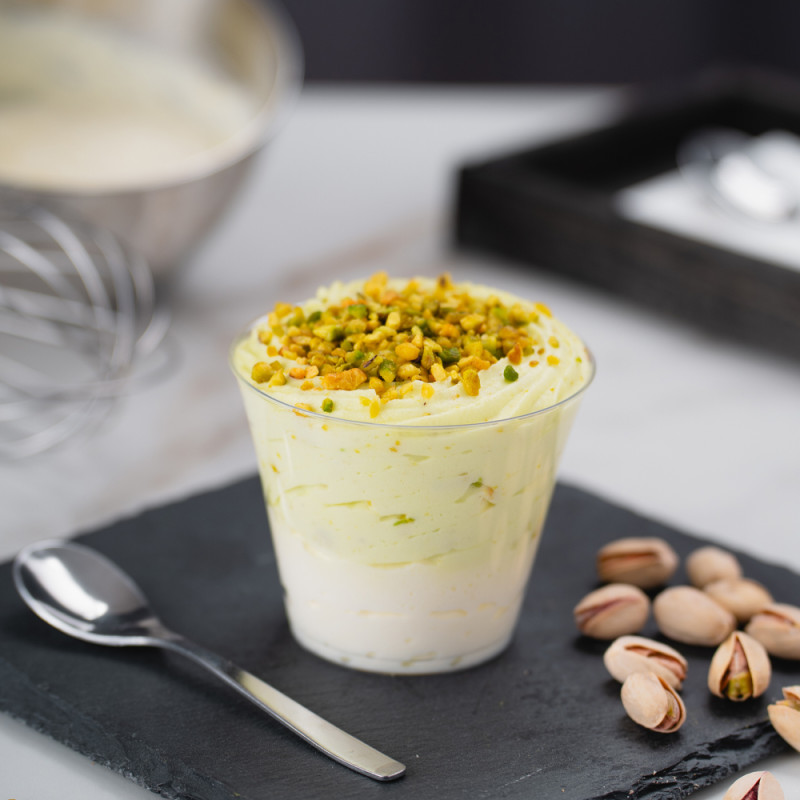 Le tiramisu Pistache associe une crème mascarpone onctueuse et un léger parfum de pistache. Prêt à servir, il enrichit facilement votre offre sucrée avec un dessert raffiné et pratique à utiliser. Disponible en lot de 12.